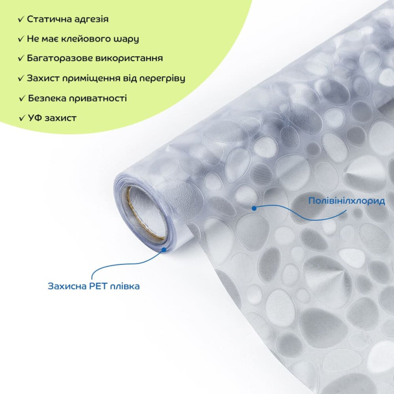 • Універсальність та легкість в монтажі: ПВХ плівки можна легко різати ножицями або монтажним ножем, що дозволяє використовувати їх у різних місцях: на вікнах, розсувних дверях, кухонних шафах та інших скляних поверхнях.