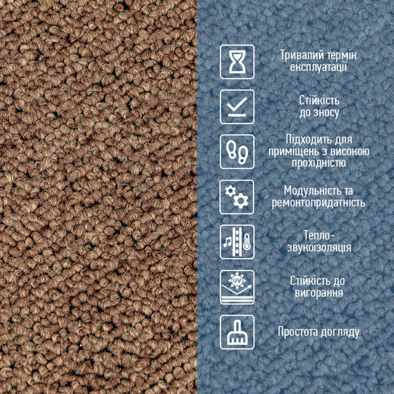 • Звукоізоляція Ковролінова плитка значно знижує рівень шуму в приміщенні, роблячи його більш комфортним і затишним. Це особливо важливо для квартир, офісів та комерційних просторів.