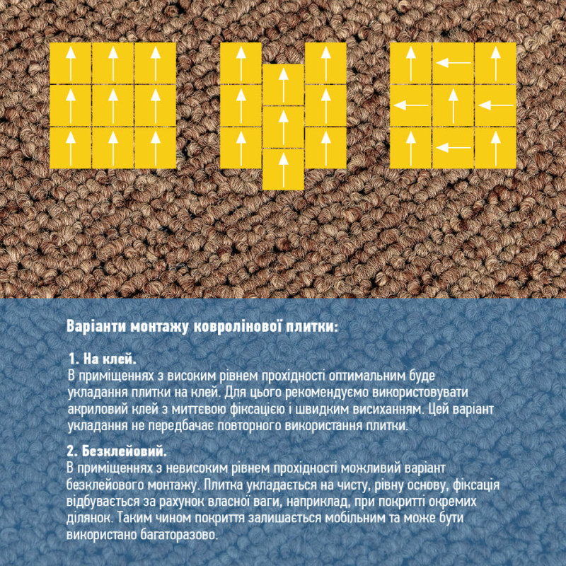 Ковролін у плитках можна монтувати на будь-яку поверхню – старий лінолеум, кахель, плитку, паркет, ламінат.
