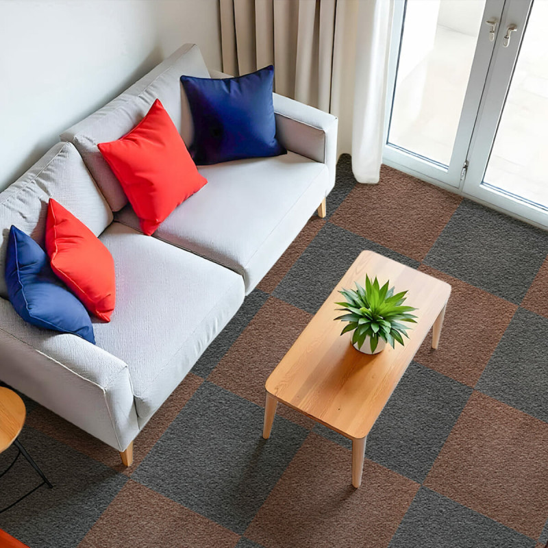 Ковролін у плитках — це сучасне модульне покриття у вигляді квадратів 50×50 см, товщиною 3–4 мм, які монтуються за рахунок власної ваги або фіксуються за допомогою клею. Вирізняється високою щільністю ворсу, завдяки чому матеріал зносостійкий, вологостійкий і підходить для покриття як малих, так і великих площ, зокрема приміщень із високою прохідністю — офісів, коридорів, залів чи житлових кімнат.