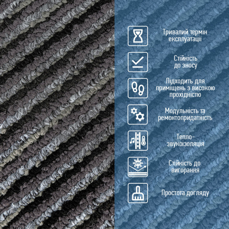 • Звукоізоляція Ковролінова плитка значно знижує рівень шуму в приміщенні, роблячи його більш комфортним і затишним. Це особливо важливо для квартир, офісів та комерційних просторів.