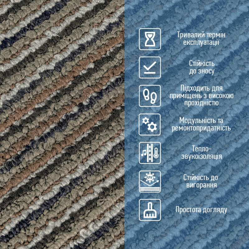 • Звукоізоляція Ковролінова плитка значно знижує рівень шуму в приміщенні, роблячи його більш комфортним і затишним. Це особливо важливо для квартир, офісів та комерційних просторів.