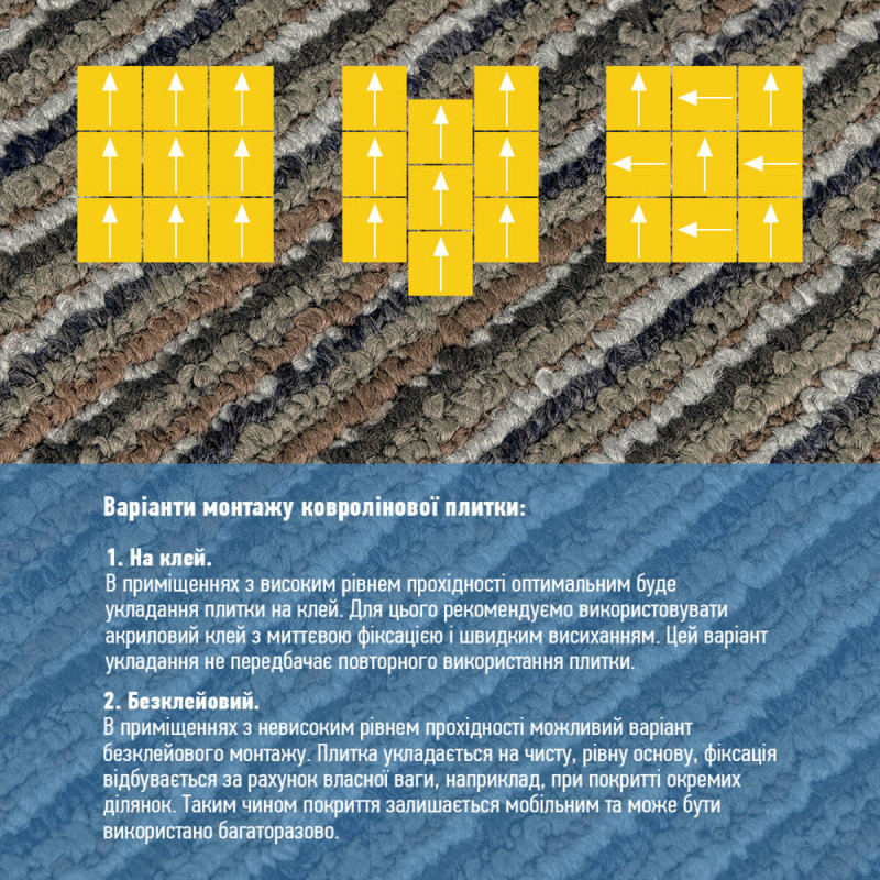 Ковролін у плитках можна монтувати на будь-яку поверхню – старий лінолеум, кахель, плитку, паркет, ламінат.