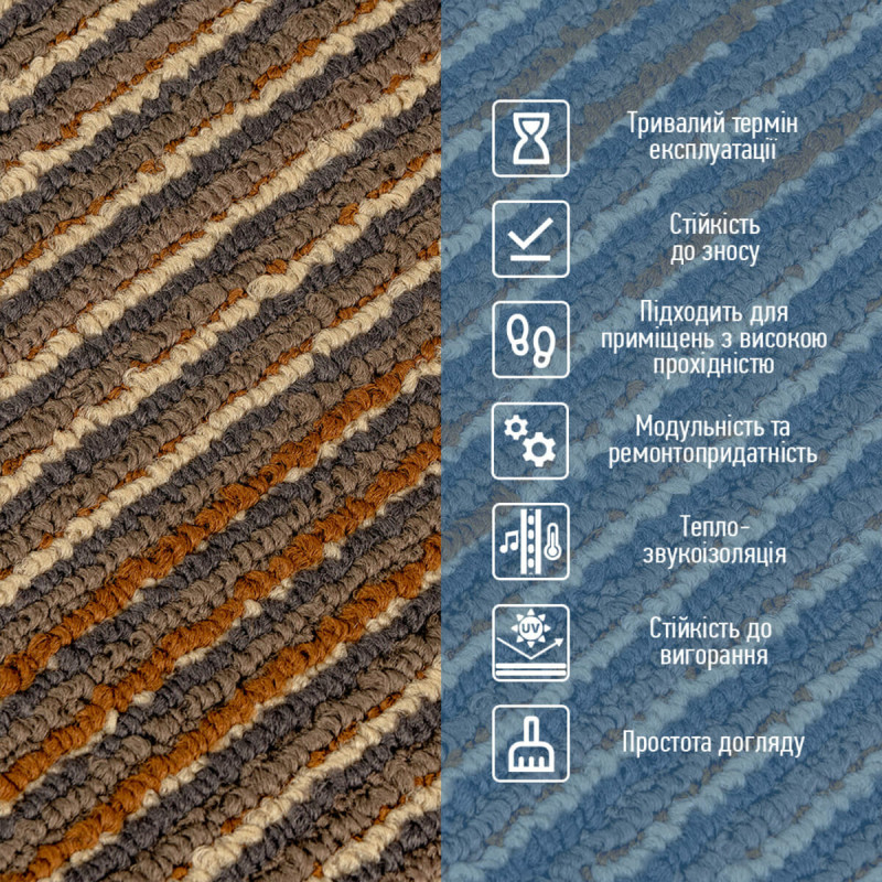 • Звукоізоляція Ковролінова плитка значно знижує рівень шуму в приміщенні, роблячи його більш комфортним і затишним. Це особливо важливо для квартир, офісів та комерційних просторів.