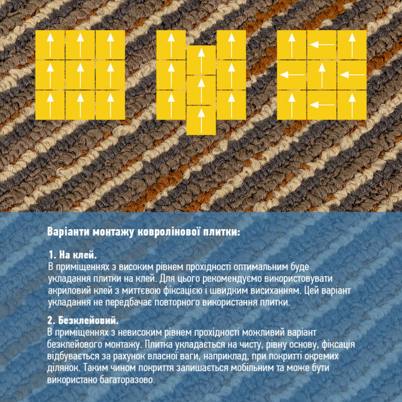 Ковролін у плитках можна монтувати на будь-яку поверхню – старий лінолеум, кахель, плитку, паркет, ламінат.