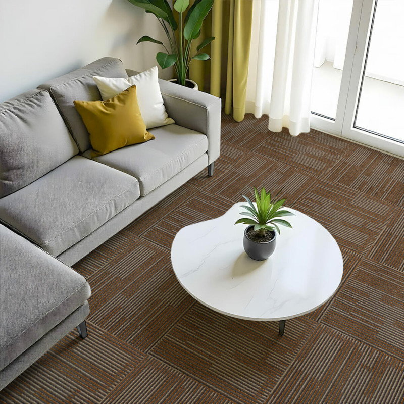 Ковролін у плитках — це сучасне модульне покриття у вигляді квадратів 50×50 см, товщиною 3–4 мм, які монтуються за рахунок власної ваги або фіксуються за допомогою клею. Вирізняється високою щільністю ворсу, завдяки чому матеріал зносостійкий, вологостійкий і підходить для покриття як малих, так і великих площ, зокрема приміщень із високою прохідністю — офісів, коридорів, залів чи житлових кімнат.