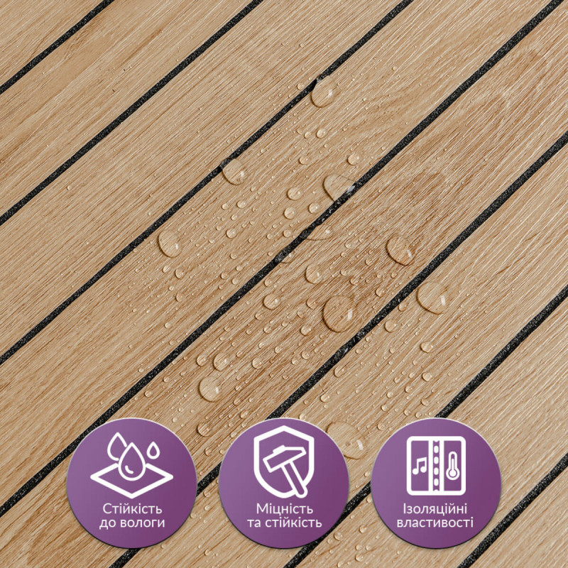 • Декоративний шар: плівка з кольоровим друком високої роздільної якості, яка повністю імітує фактуру природних матеріалів завдяки чіткому та деталізованому зображенню.