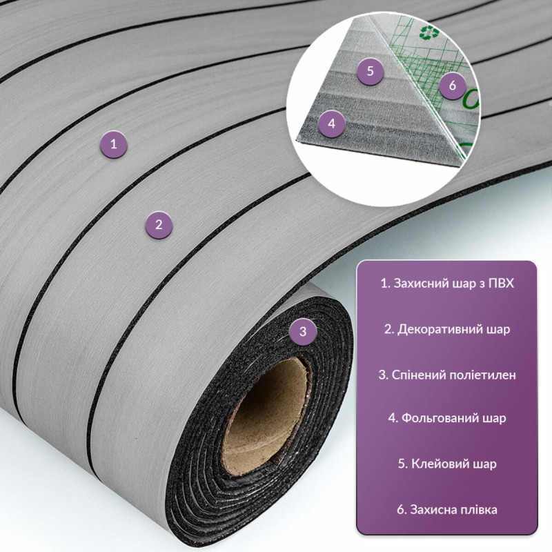 • Декоративний шар: плівка з кольоровим друком високої роздільної якості, яка повністю імітує фактуру природних матеріалів завдяки чіткому та деталізованому зображенню.