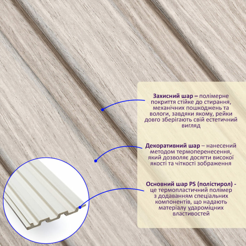 - Захисний шар – полімерне покриття стійке до стирання, механічних пошкоджень та вологи, завдяки якому, рейки довго зберігають свій естетичний вигляд.