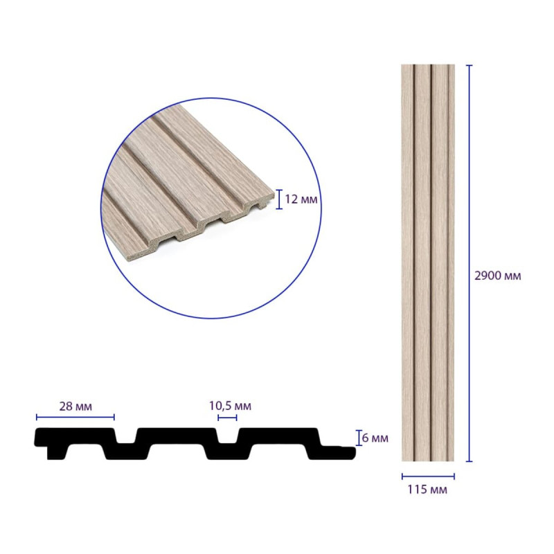 - Площа покриття: 115х2900х12 мм – 0,34 м², кількість на 1 м² – 3 одиниці.