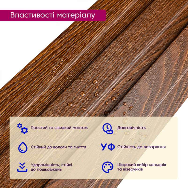 Стійкість до впливу ультрафіолету: стінові панелі WPC зберігають свій колір та структуру під впливом ультрафіолетового випромінювання.