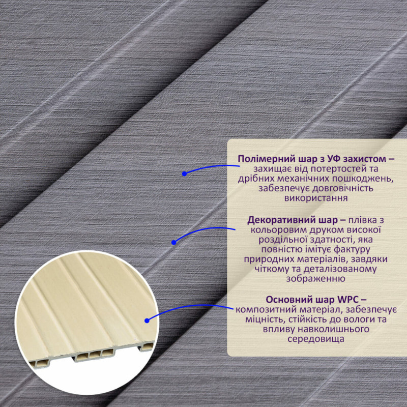 Основний шар WPC: є композитним матеріалом, який поєднує в собі деревні волокна (або стружку) з полімерними матеріалами, що забезпечує матеріалу міцність, стійкість до вологи і стійкість до впливу зовнішнього середовища.
