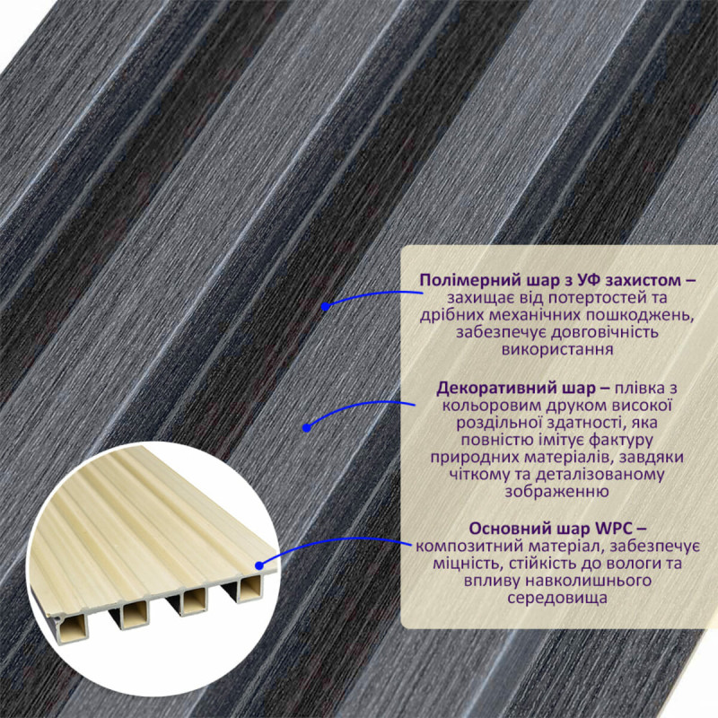 • Стійкість до впливу ультрафіолету: стінові панелі WPC зберігають свій колір та структуру під впливом ультрафіолетового випромінювання.