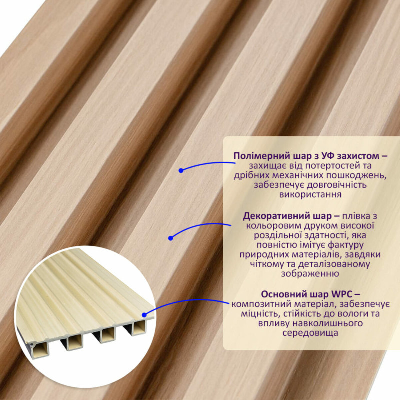 Стійкість до впливу ультрафіолету: стінові панелі WPC зберігають свій колір та структуру під впливом ультрафіолетового випромінювання.