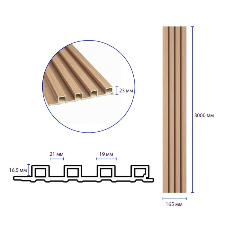 Опис: Стінові рейки WPC – будівельний матеріал для внутрішнього оздоблення, що імітує натуральну деревину.