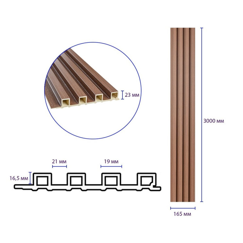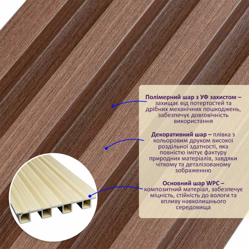 Опис: Стінові рейки WPC – будівельний матеріал для внутрішнього оздоблення, що імітує натуральну деревину.