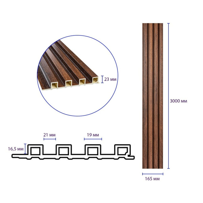 Опис: Стінові рейки WPC – будівельний матеріал для внутрішнього оздоблення, що імітує натуральну деревину.