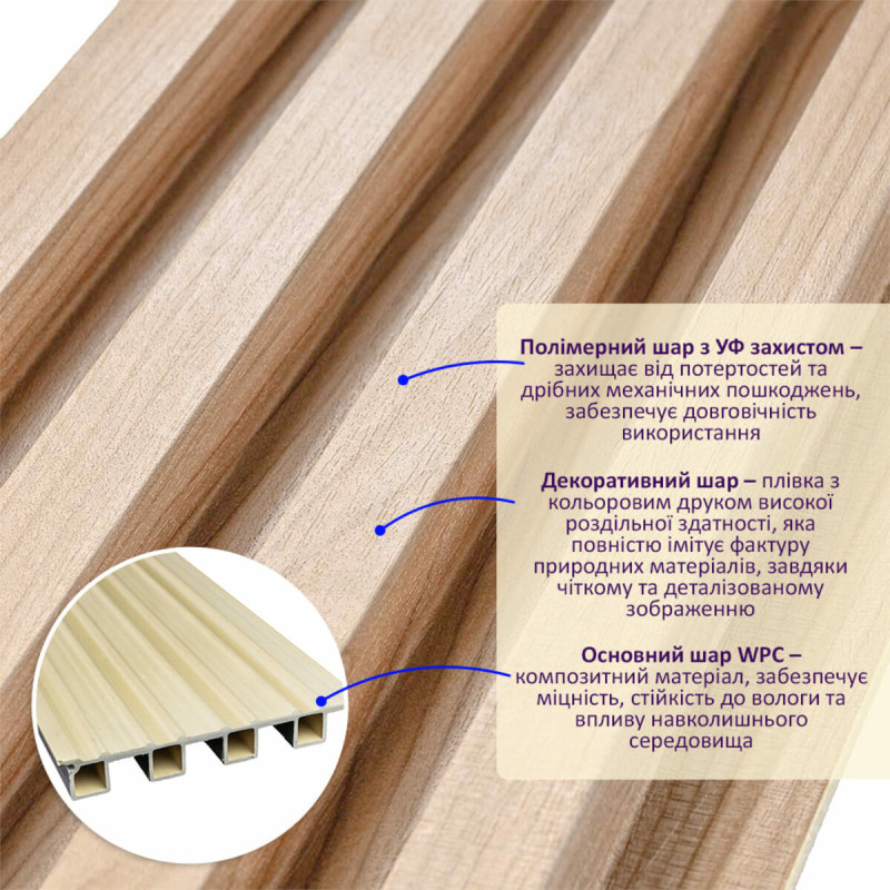 • Стійкість до впливу ультрафіолету: стінові панелі WPC зберігають свій колір та структуру під впливом ультрафіолетового випромінювання.