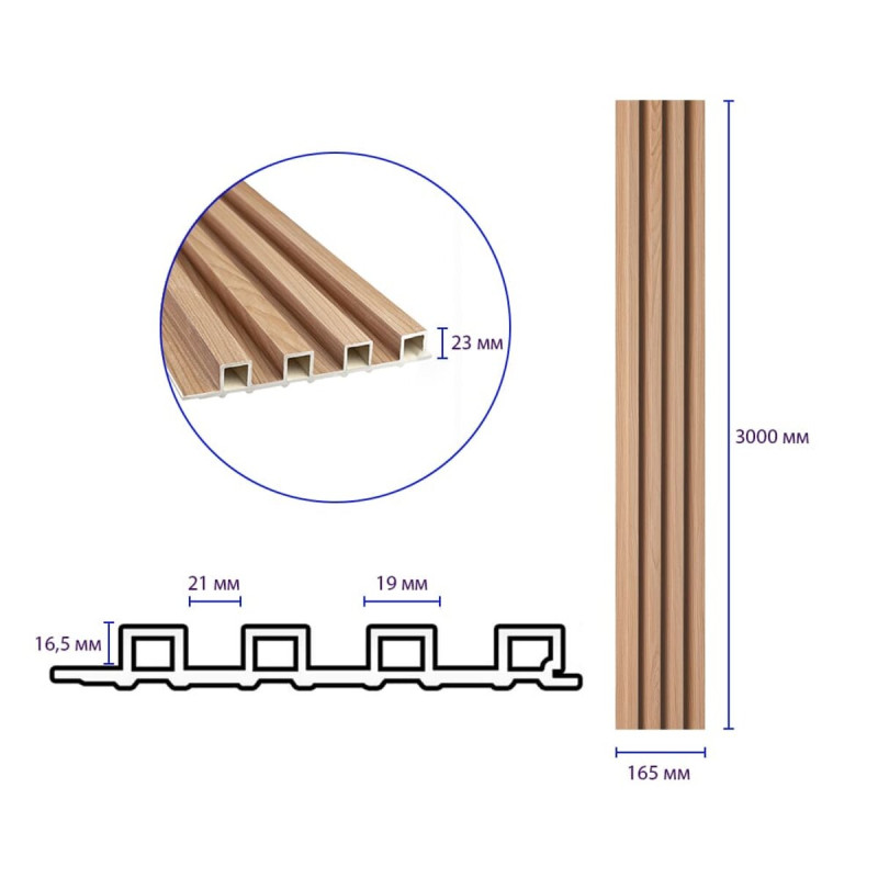 Опис: Стінові рейки WPC – будівельний матеріал для внутрішнього оздоблення, що імітує натуральну деревину.