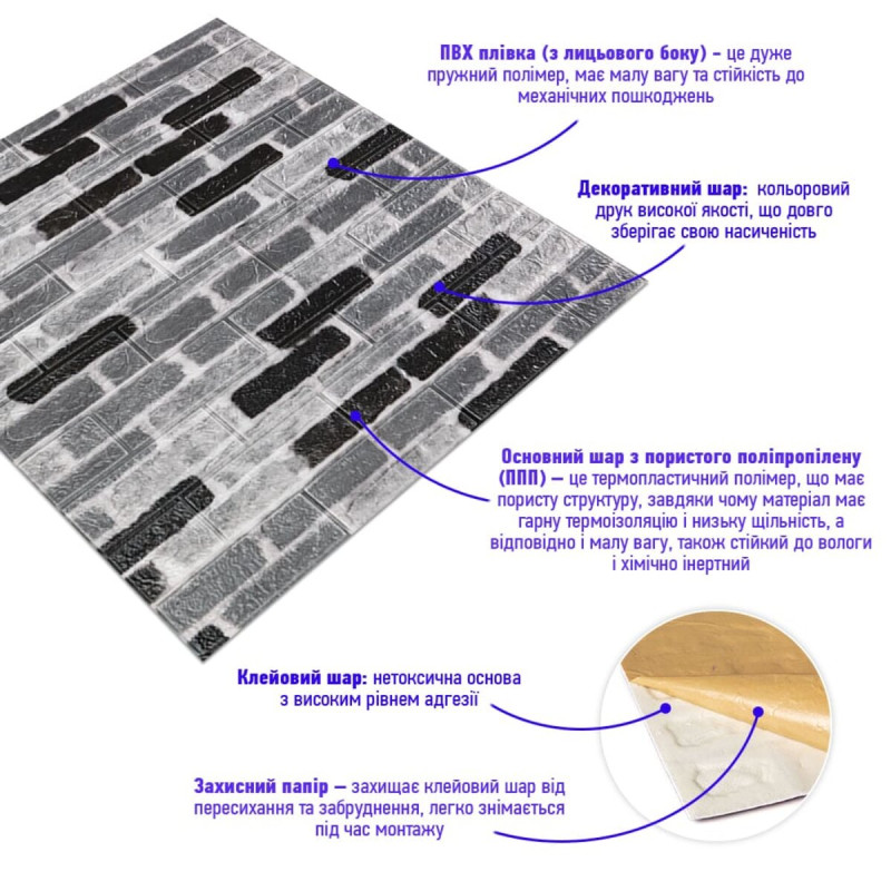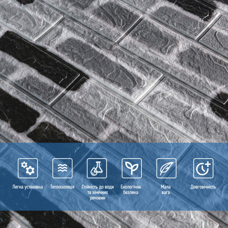 3D панелі самоклеючі – декоративне покриття для стін, виконане з легкого та міцного матеріалу – пористого поліпропілену (ППП). Основна особливість – рельєфний малюнок у вигляді цегли у широкому різноманітті кольорів та наявність клейового шару, що дозволяє встановити панелі без необхідності застосування додаткових матеріалів.
