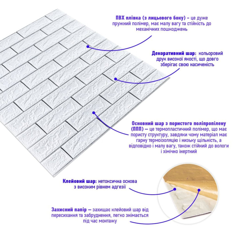 3D панелі самоклеючі – декоративне покриття для стін, виконане з легкого та міцного матеріалу – пористого поліпропілену (ППП). Основна особливість – рельєфний малюнок у вигляді цегли у широкому різноманітті кольорів та наявність клейового шару, що дозволяє встановити панелі без необхідності застосування додаткових матеріалів.