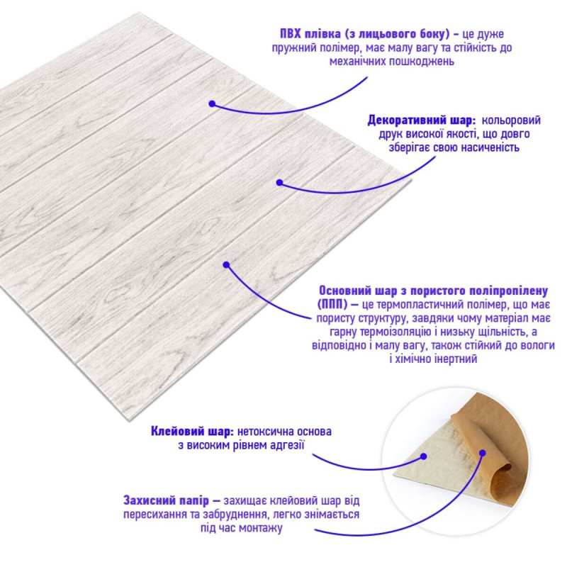 - Легкість монтажу: наявність клейового шару дозволяє встановити панелі без необхідності застосування додаткових матеріалів.