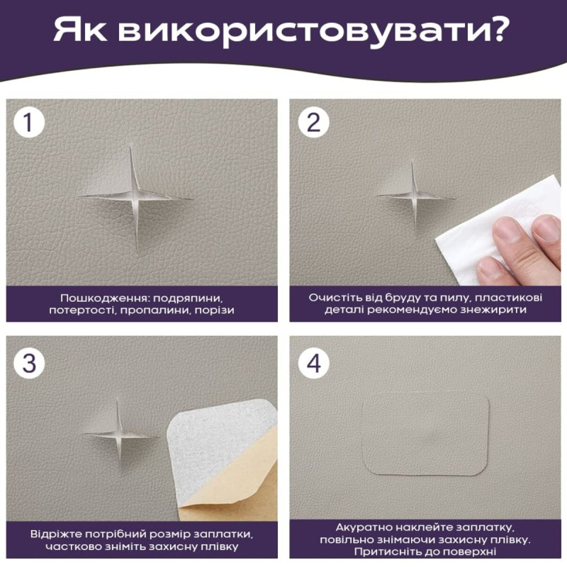 - Матеріал представлений смугами досить великої довжини: 1 м та 3 м, що збільшує варіативність розміру площі використання: від малих, фігурних латок до усунення дефектів великих шкіряних поверхонь;