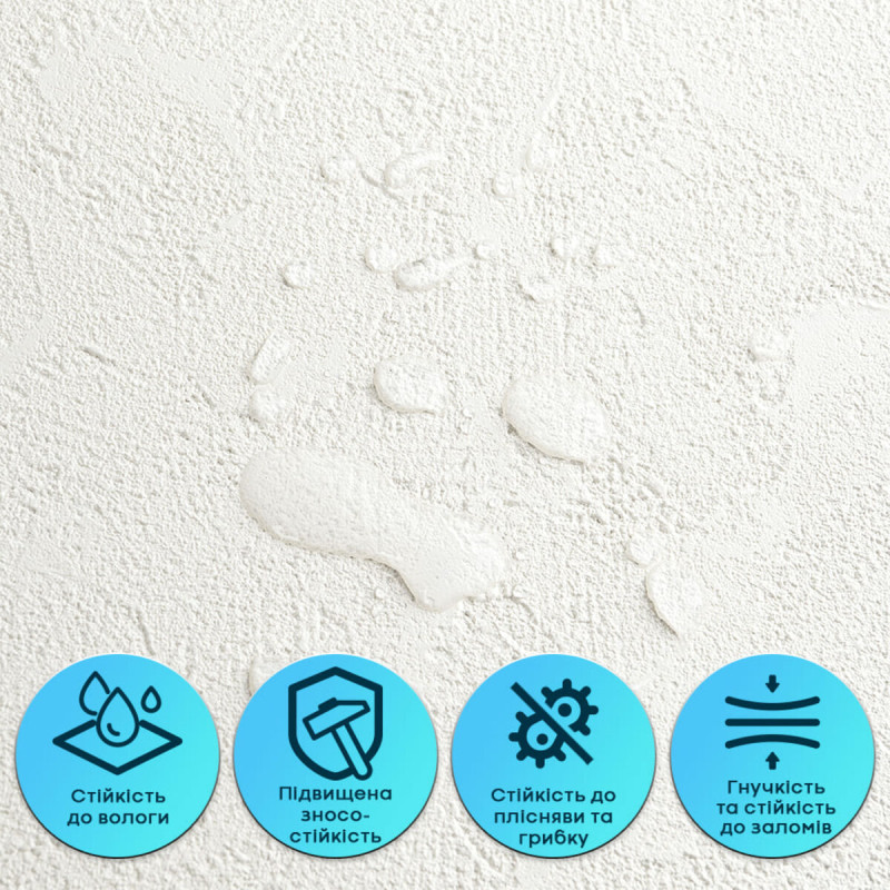 • Стійкість до вологи та пари Гнучка штукатурка не вбирає воду, не набухає та не деформується під впливом вологи. Матеріал стійкий до пари, не сприяє утворенню плісняви та підходить для приміщень із підвищеною вологістю — кухонь, ванних кімнат. Може застосовуватися в зоні кухонного фартуха (за умови відступу від плити на 25-30 см).