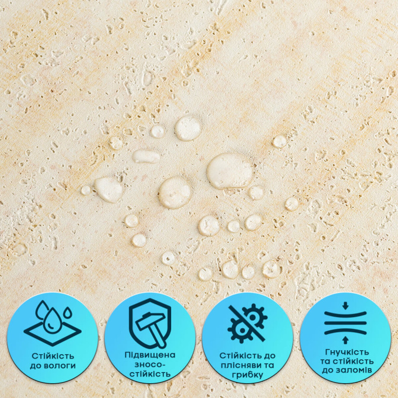• Стійкість до вологи та пари Гнучка штукатурка не вбирає воду, не набухає та не деформується під впливом вологи. Матеріал стійкий до пари, не сприяє утворенню плісняви та підходить для приміщень із підвищеною вологістю — кухонь, ванних кімнат. Може застосовуватися в зоні кухонного фартуха (за умови відступу від плити на 25-30 см).