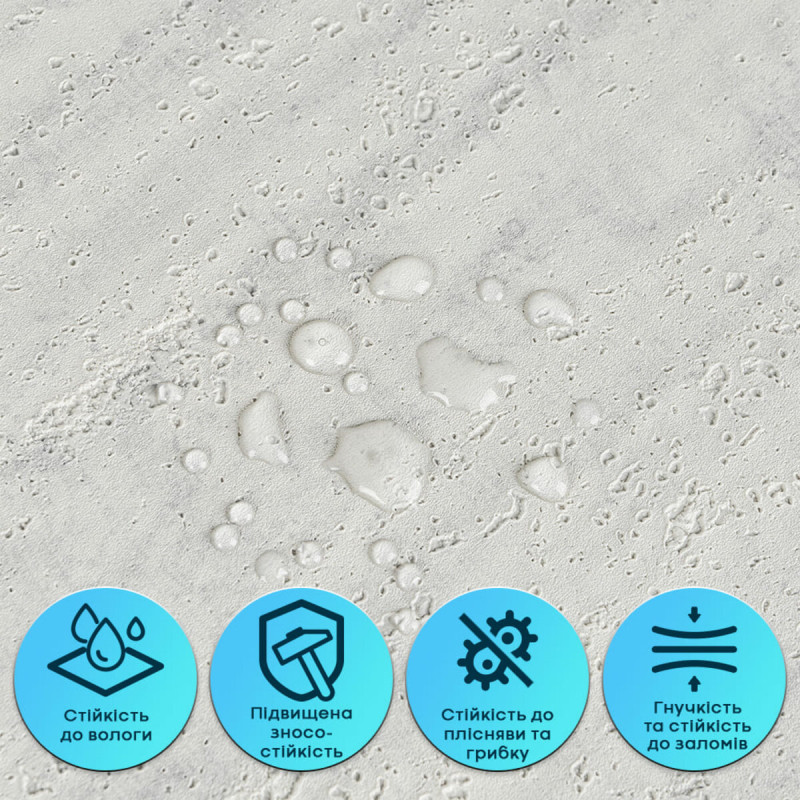 • Стійкість до вологи та пари Гнучка штукатурка не вбирає воду, не набухає та не деформується під впливом вологи. Матеріал стійкий до пари, не сприяє утворенню плісняви та підходить для приміщень із підвищеною вологістю — кухонь, ванних кімнат. Може застосовуватися в зоні кухонного фартуха (за умови відступу від плити на 25-30 см).