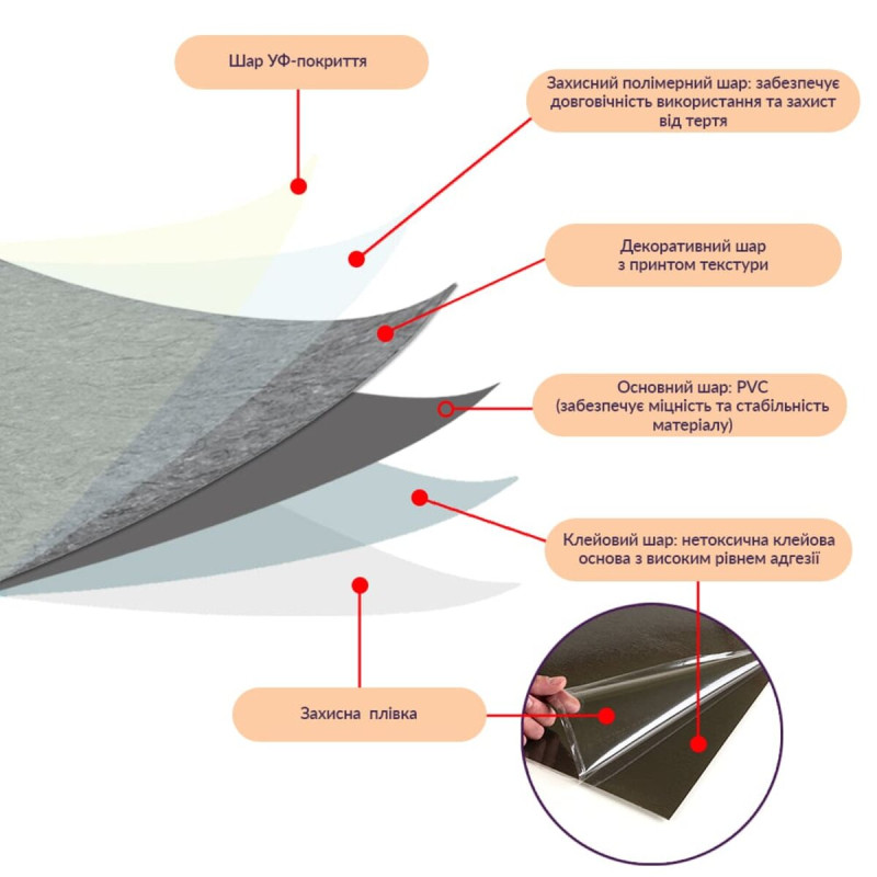 - Декоративний шар: плівка із кольоровим друком, який повністю передає фактуру природних матеріалів: деревини, каменю та інших