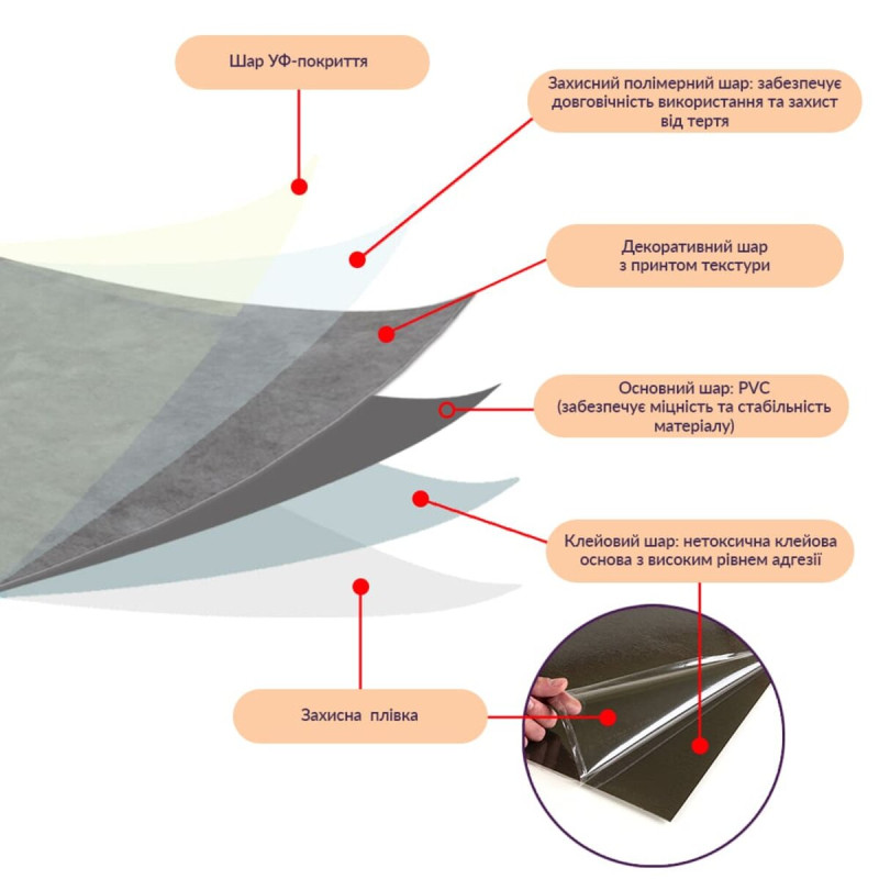 - Декоративний шар: плівка із кольоровим друком, який повністю передає фактуру природних матеріалів: деревини, каменю та інших