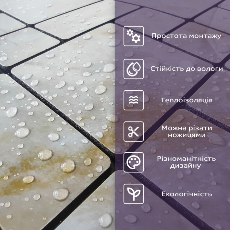 - Стійкість до вологи: матеріал стійкий до впливу вологи та пари, а також до появи плісняви, що робить його придатним для використання у приміщеннях з високою вологістю, таких як ванни та кухні. Плитка підходить для створення фартуха кухні, можна клеїти біля плити на відстані не менше ніж 20-25 см;
