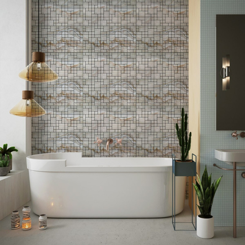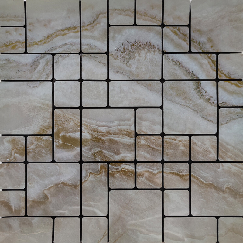 Плитка з ПЕТ (поліетилентерефталату) часто використовується для створення мозаїчних візерунків та декоративних елементів. PET - це пластичний матеріал, який має цілий ряд переваг: легкість, міцність і стійкість до впливу вологи. Цей матеріал може бути використаний для створення внутрішнього оздоблення як у житлових, так і у комерційних приміщеннях.
