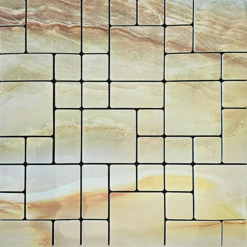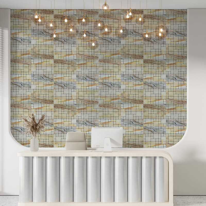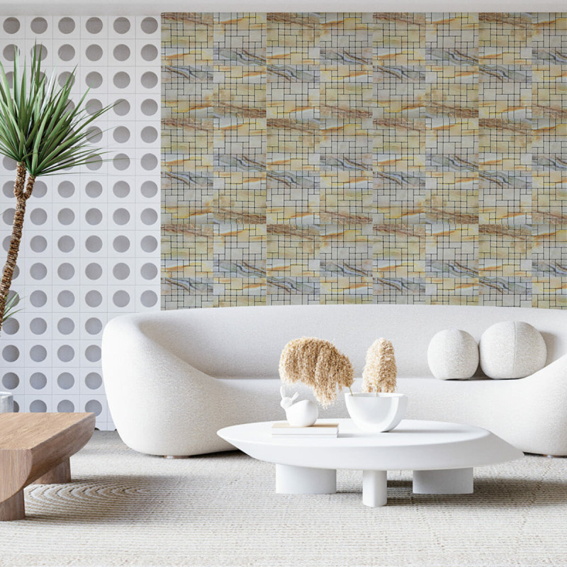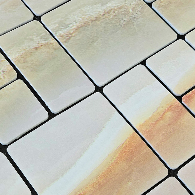 Плитка з ПЕТ (поліетилентерефталату) часто використовується для створення мозаїчних візерунків та декоративних елементів. PET - це пластичний матеріал, який має цілий ряд переваг: легкість, міцність і стійкість до впливу вологи. Цей матеріал може бути використаний для створення внутрішнього оздоблення як у житлових, так і у комерційних приміщеннях.