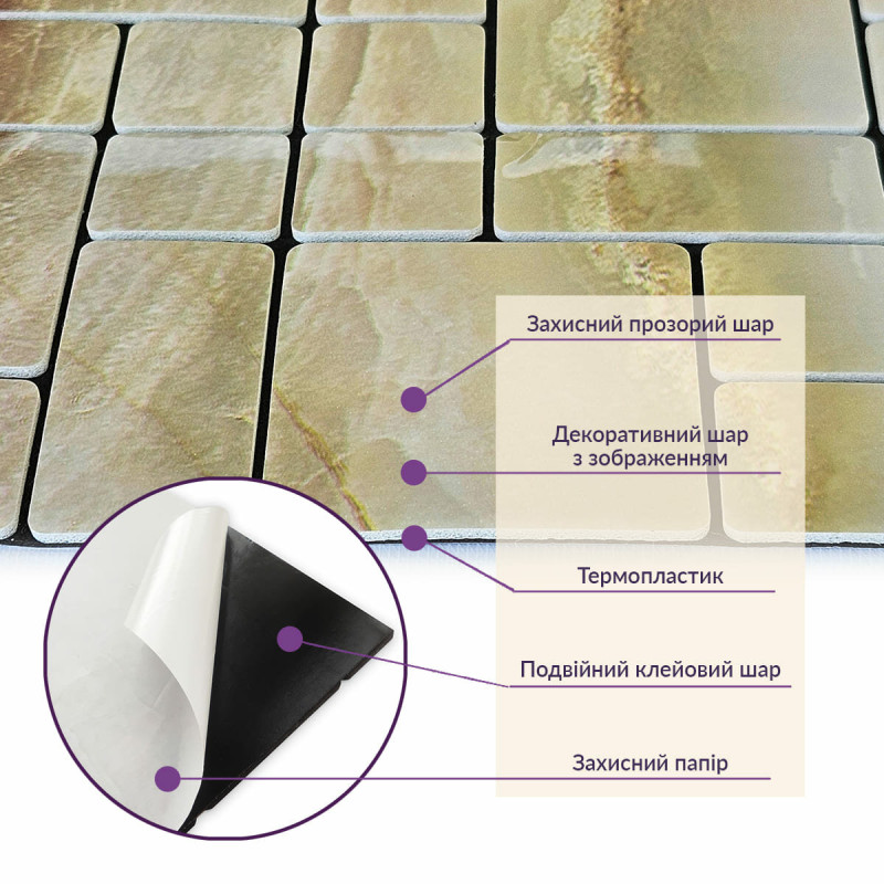 Зняти захисну плівку зі зворотного боку плитки, щоб відкрити клейку поверхню.