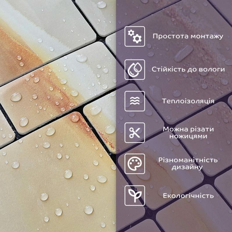 - Стійкість до вологи: матеріал стійкий до впливу вологи та пари, а також до появи плісняви, що робить його придатним для використання у приміщеннях з високою вологістю, таких як ванни та кухні. Плитка підходить для створення фартуха кухні, можна клеїти біля плити на відстані не менше ніж 20-25 см;