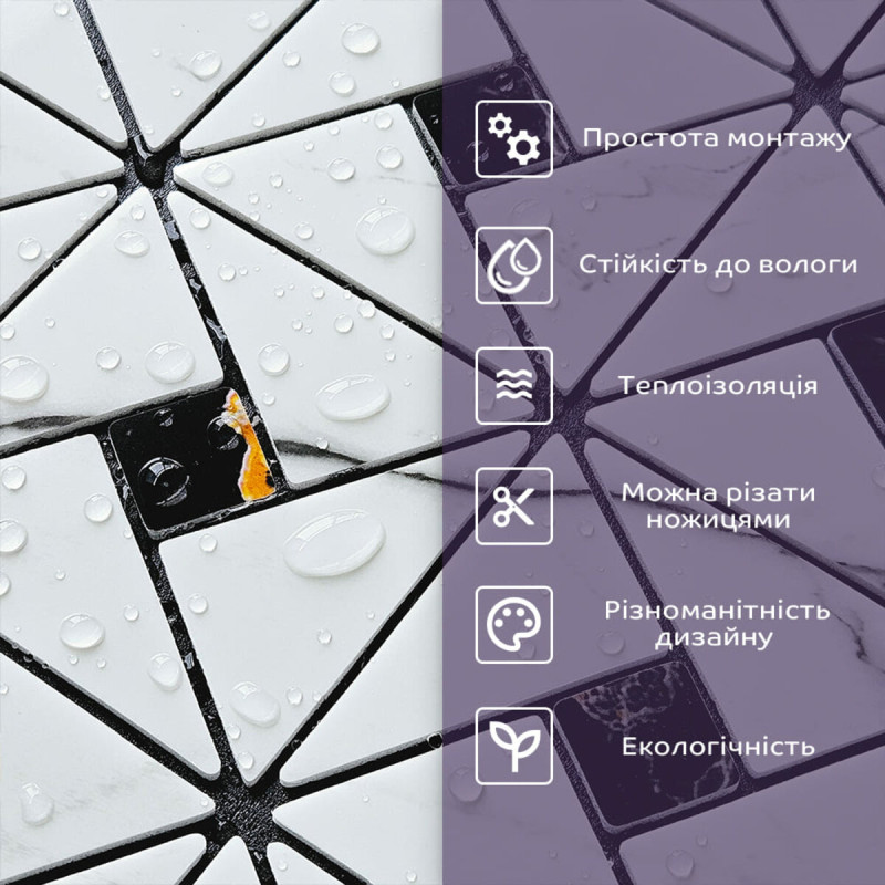 - Стійкість до вологи: матеріал стійкий до впливу вологи та пари, а також до появи плісняви, що робить його придатним для використання у приміщеннях з високою вологістю, таких як ванни та кухні. Плитка підходить для створення фартуха кухні, можна клеїти біля плити на відстані не менше ніж 20-25 см;