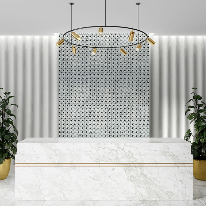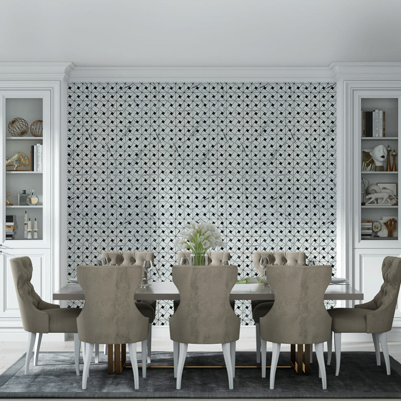 Плитка з ПЕТ (поліетилентерефталату) часто використовується для створення мозаїчних візерунків та декоративних елементів. PET - це пластичний матеріал, який має цілий ряд переваг: легкість, міцність і стійкість до впливу вологи. Цей матеріал може бути використаний для створення внутрішнього оздоблення як у житлових, так і у комерційних приміщеннях.
