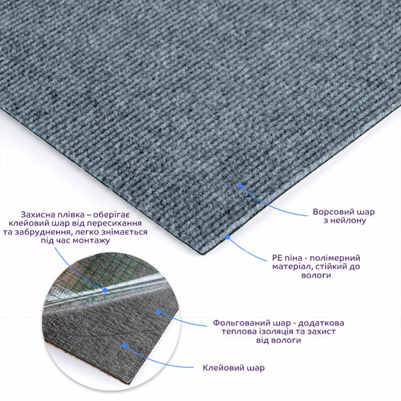 • Догляд: ковролінова плитка легко чиститься і миється, що робить її догляд простим та зручним.