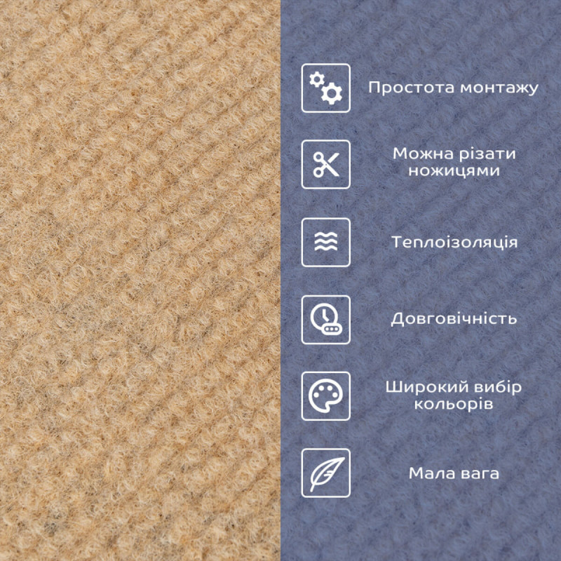 Колір ковроліну може трохи змінюватись в залежності від освітлення та напрямку ворсу. Для досягнення однорідного відтінку рекомендується укладати покриття в одному напрямку.