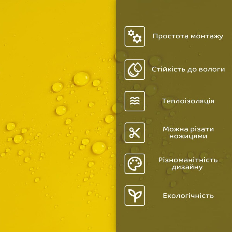 - 1. Легкість та міцність: плитка легка та міцна, що спрощує її логістику, установку та забезпечує довгий термін служби. Матеріал легкий в установці, можна різати ножицями чи монтажним ножем, не потребує додаткових матеріалів чи спеціалістів. Між смугами не розходиться, не роздмухується і не деформується. Відсоток обрізу становить 1%, що є найкращим показником для настінних покриттів;