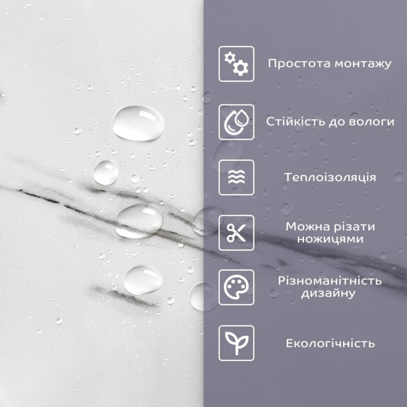 - 2. Стійкість до вологи: матеріал стійкий до впливу вологи та пари, а також до появи плісняви, що робить його придатним для використання у приміщеннях з високою вологістю, таких як ванни та кухні. Плитка підходить для створення фартуха кухні, можна клеїти біля плити на відстані не менше ніж 20-25 см;