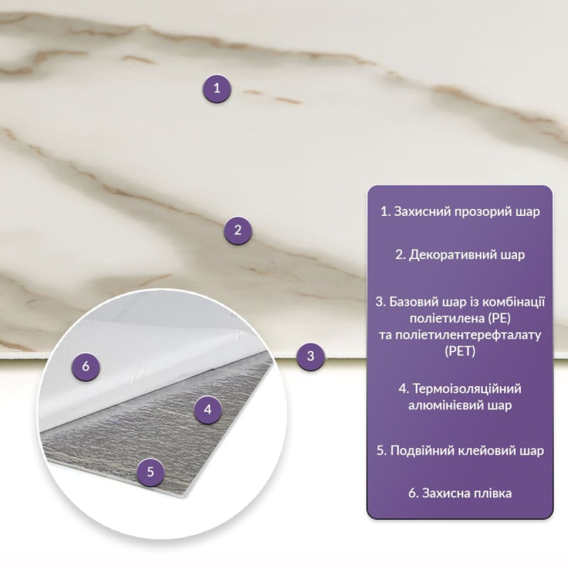 - 3. Ізоляція: плитка має звукову та теплоізоляцію завдяки наявності повітряних прошарків та додатковому алюмінієвому шару;