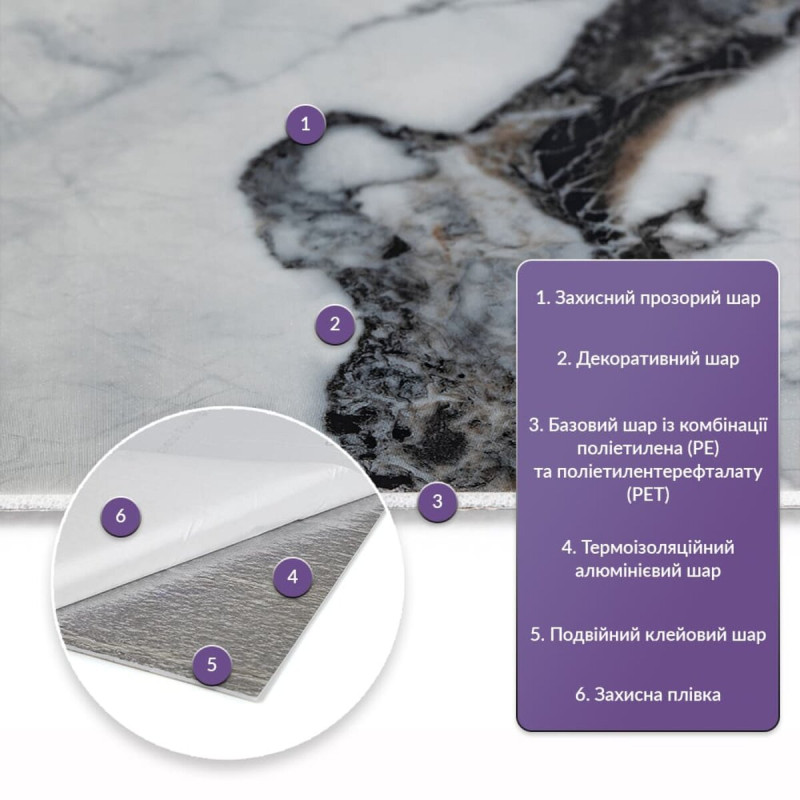 Як і в натуральних матеріалах, малюнки РЕТ плиток можуть трохи відрізнятися між собою, зберігаючи при цьому загальний дизайн та колір, що ще більше підкреслює природну імітацію. Також просимо взяти до уваги, що виробник має право змінювати зовнішній вигляд товару, зокрема відтінок та малюнок, на власний розсуд і без попереднього повідомлення.Шари матеріалу: