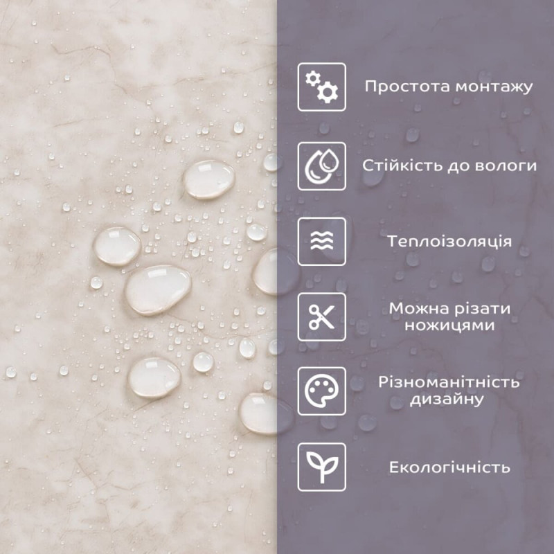 - 2. Стійкість до вологи: матеріал стійкий до впливу вологи та пари, а також до появи плісняви, що робить його придатним для використання у приміщеннях з високою вологістю, таких як ванни та кухні. Плитка підходить для створення фартуха кухні, можна клеїти біля плити на відстані не менше ніж 20-25 см;