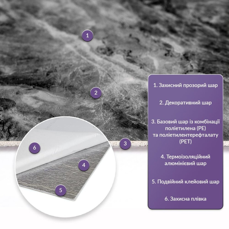 Як і в натуральних матеріалах, малюнки РЕТ плиток можуть трохи відрізнятися між собою, зберігаючи при цьому загальний дизайн та колір, що ще більше підкреслює природну імітацію. Також просимо взяти до уваги, що виробник має право змінювати зовнішній вигляд товару, зокрема відтінок та малюнок, на власний розсуд і без попереднього повідомлення.Шари матеріалу: