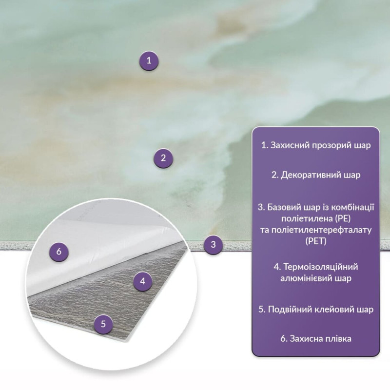 Як і в натуральних матеріалах, малюнки РЕТ плиток можуть трохи відрізнятися між собою, зберігаючи при цьому загальний дизайн та колір, що ще більше підкреслює природну імітацію. Також просимо взяти до уваги, що виробник має право змінювати зовнішній вигляд товару, зокрема відтінок та малюнок, на власний розсуд і без попереднього повідомлення.Шари матеріалу:
