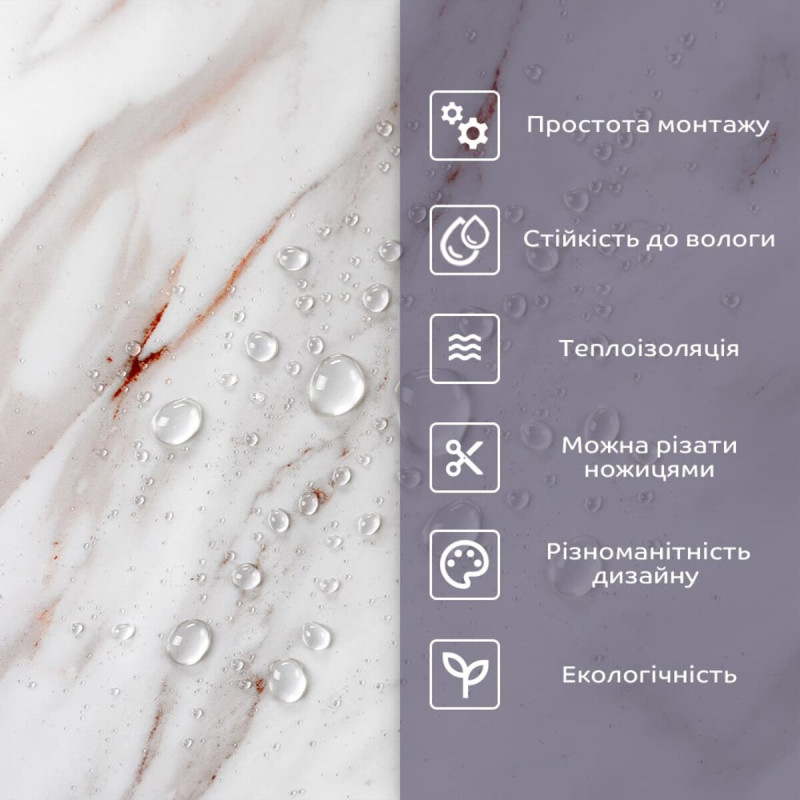- 2. Стійкість до вологи: матеріал стійкий до впливу вологи та пари, а також до появи плісняви, що робить його придатним для використання у приміщеннях з високою вологістю, таких як ванни та кухні. Плитка підходить для створення фартуха кухні, можна клеїти біля плити на відстані не менше ніж 20-25 см;