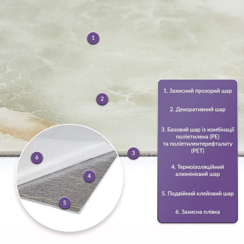 Як і в натуральних матеріалах, малюнки РЕТ плиток можуть трохи відрізнятися між собою, зберігаючи при цьому загальний дизайн та колір, що ще більше підкреслює природну імітацію. Також просимо взяти до уваги, що виробник має право змінювати зовнішній вигляд товару, зокрема відтінок та малюнок, на власний розсуд і без попереднього повідомлення.Шари матеріалу: